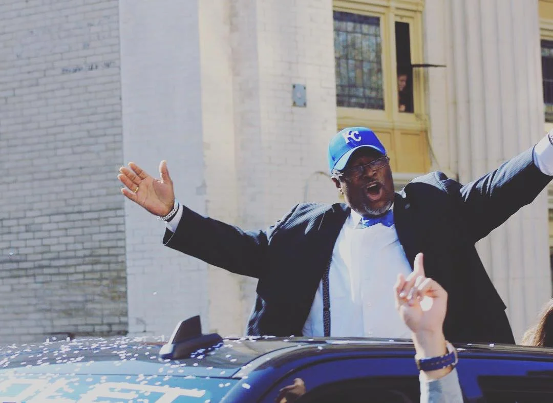 MAYOR SLY JAMES IN THE KC PRIDE BOW TIE AT THE PARADE AFTER THE ROYAL WON THE WORLD SERIES IN 2015.